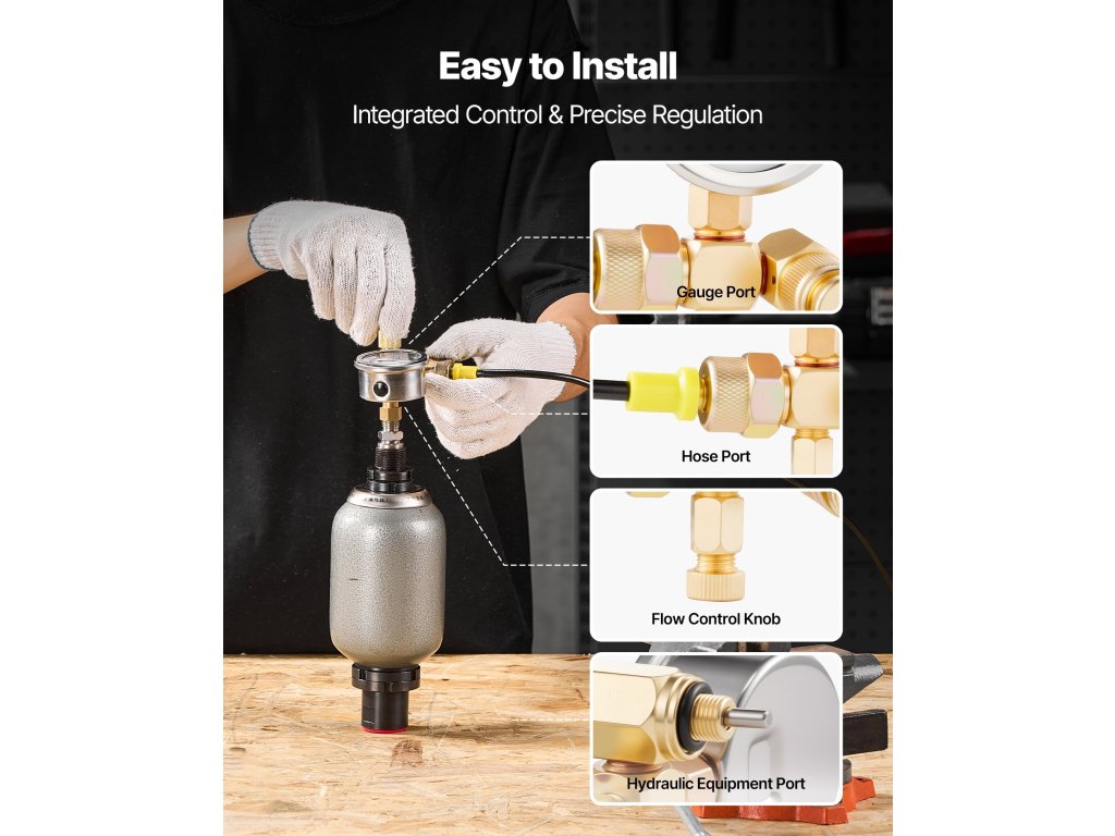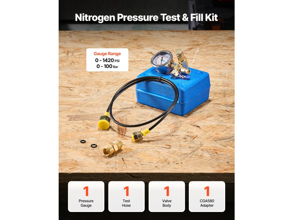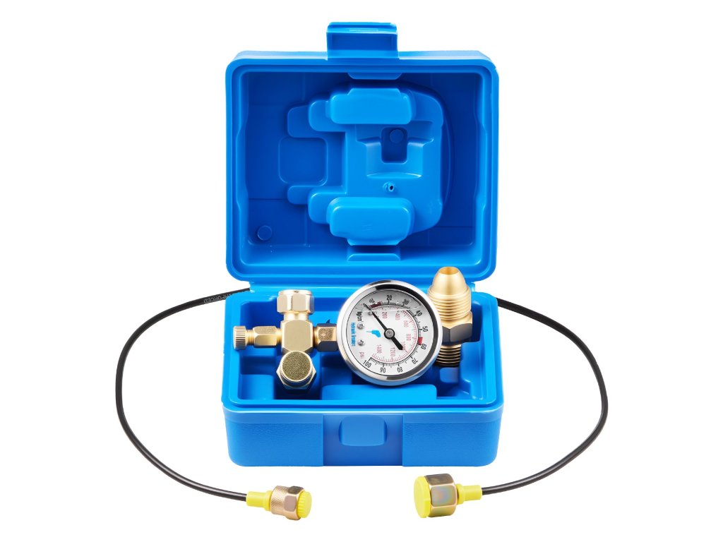 Ez a hidraulikus nyomásvizsgálati készlet egyetlen kompakt készletben képes egypontos vizsgálatot végezni. Tartalmazza a nitrogén töltőszelepet, a mechanikus nyomásmérőt és az adapterillesztéket. Az alacsony nyomású akkumulátorok rutinszerű nyomásellenőrzésére és időben történő karbantartására szolgál.