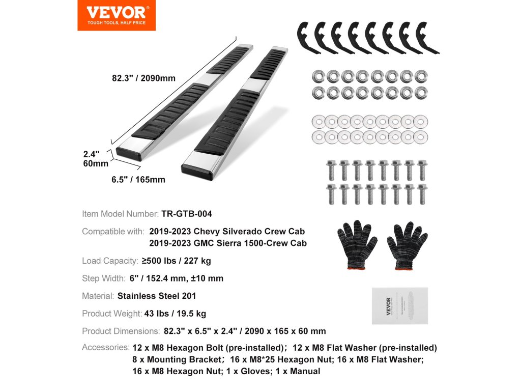 Oldalsó fellépők 6" rozsdamentes acélból, 201, 500 font, 2 darabos, duplafülkés 2019-2024 modellhez