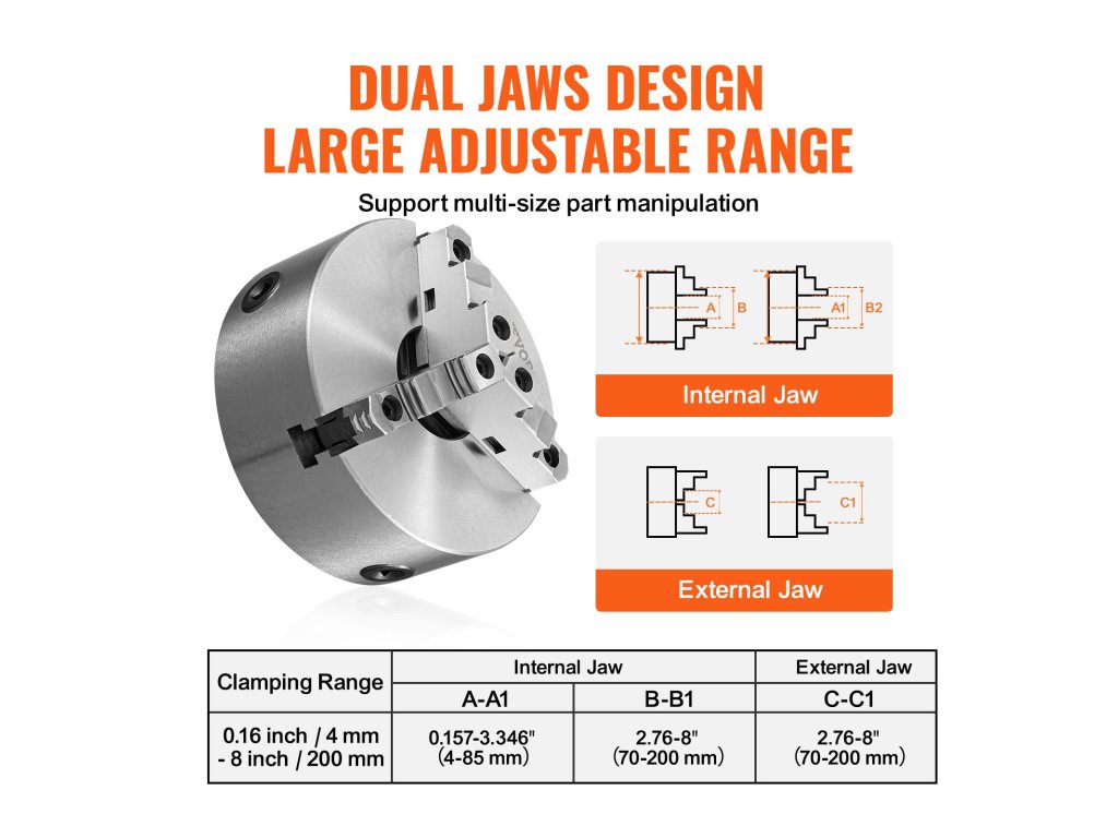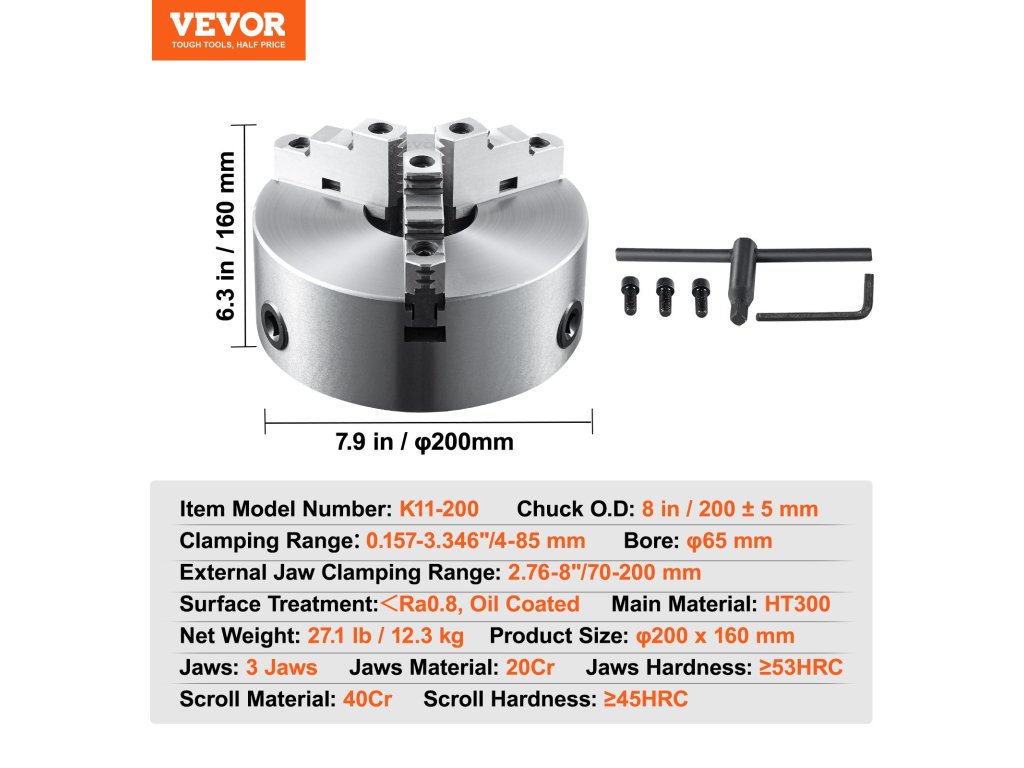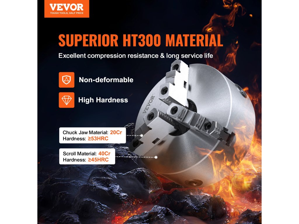 a 8'' 3-pofás esztergapofa tokmány HT300 nagy szilárdságú anyagból készült, erős nyomószilárdsággal és hosszú élettartammal. Belső és külső pofaként használható nagyobb méretű ipari alkatrészek befogására, és önközpontosító funkcióval rendelkezik az újrakalibrálás elkerülése érdekében.
