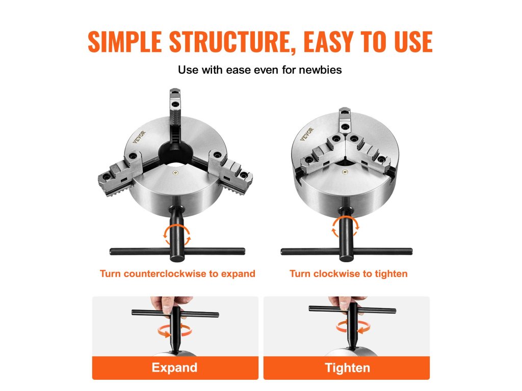 A hárompofás tokmány önközpontosító funkcióval és ferde fogaskerékkel rendelkezik, hogy pontosan szabályozza a befogott munkadarab pontosságát a precíziós megmunkáláshoz. A ≤ 0,05 mm / 0,002" csapágyazási tűrés biztosítja az esztergafogó szerkezeti stabilitását és nagy pontosságát.