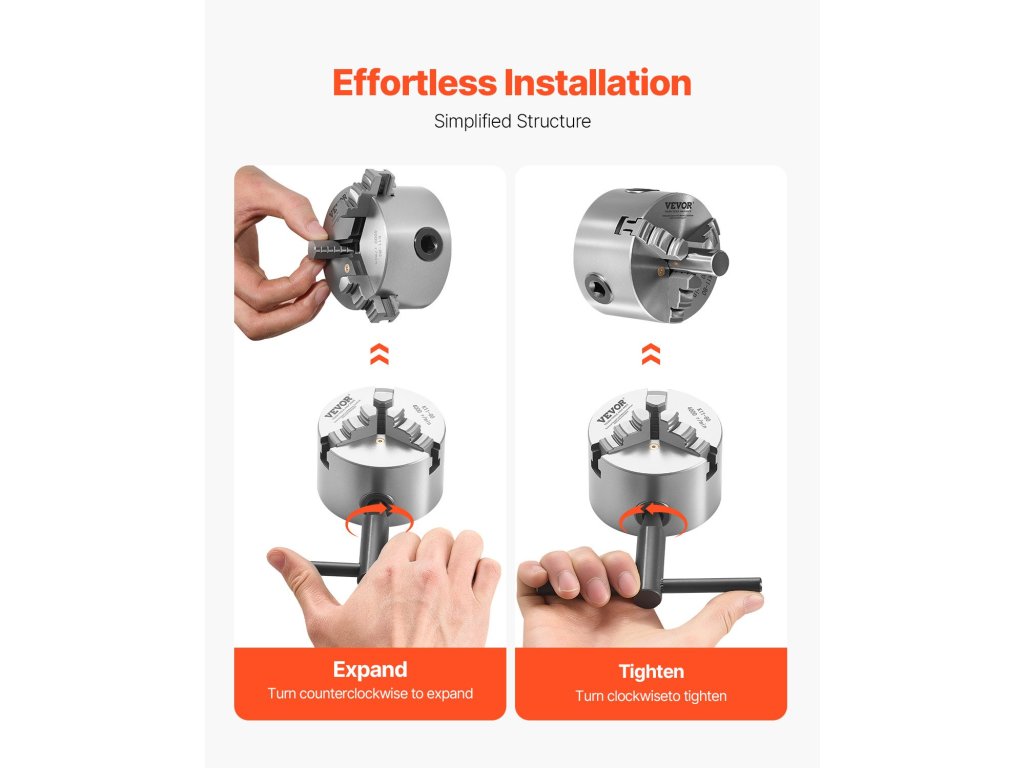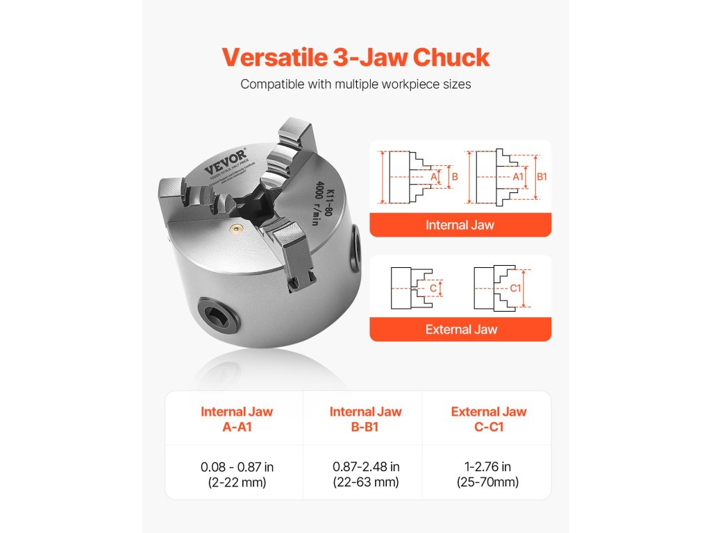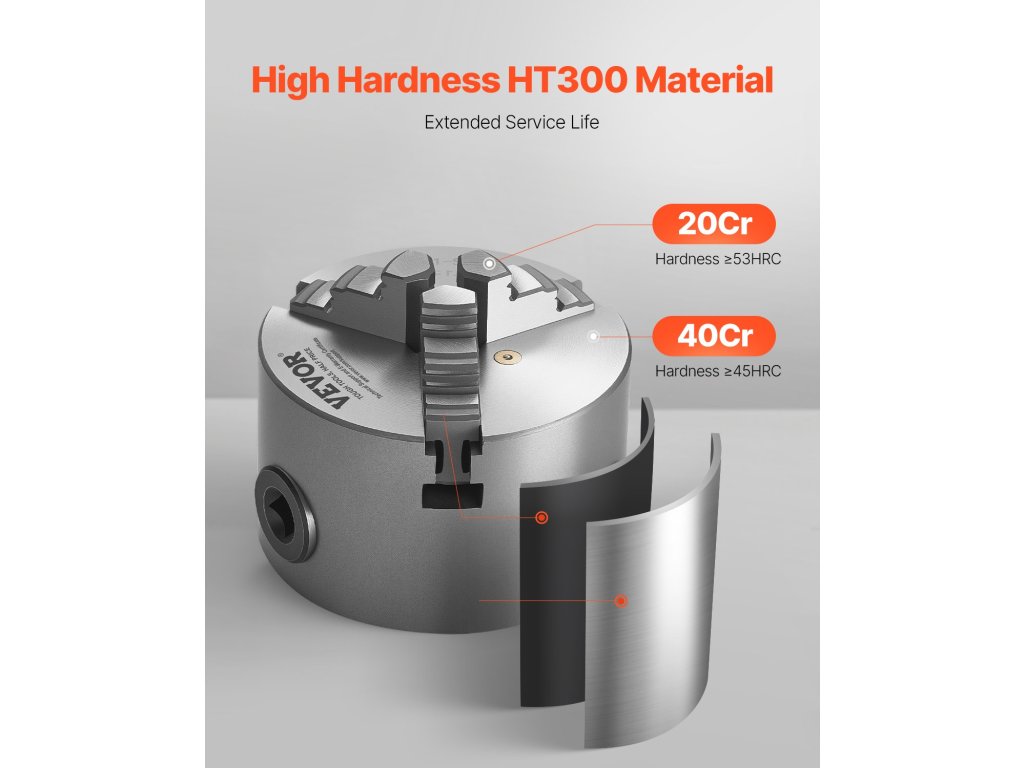 Prémium HT300 öntöttvasból készült, a hosszú élettartam és a korrózióállóság érdekében az állkapocs keménysége ≥53 HRC. Az önközpontosító esztergafogó tokmány nagy pontosságú rögzítést biztosít kalibrálás nélkül. A 0,63 hüvelykes belső átmérővel és a 3 hüvelykes külső átmérővel könnyen kezeli a 0,08 hüvelyk és 2,48 hüvelyk közötti befogási tartományokat.