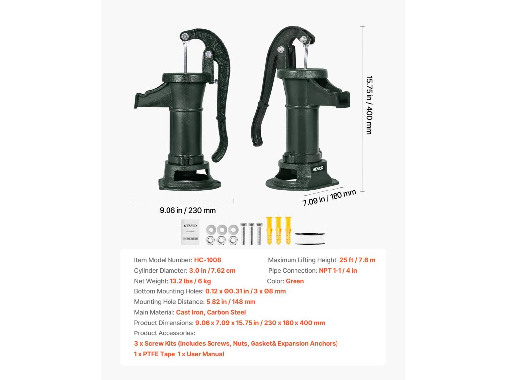 Ez a prémium minőségű anyagokból készült öntöttvas kézi vízszivattyú stabil és tartós teljesítményt nyújt. A gyakori használat során ellenáll a hajlításnak és a törésnek. A megbízható tömítés csökkenti a levegő bejutását, növelve a vízszivattyú hatékonyságát és sebességét.