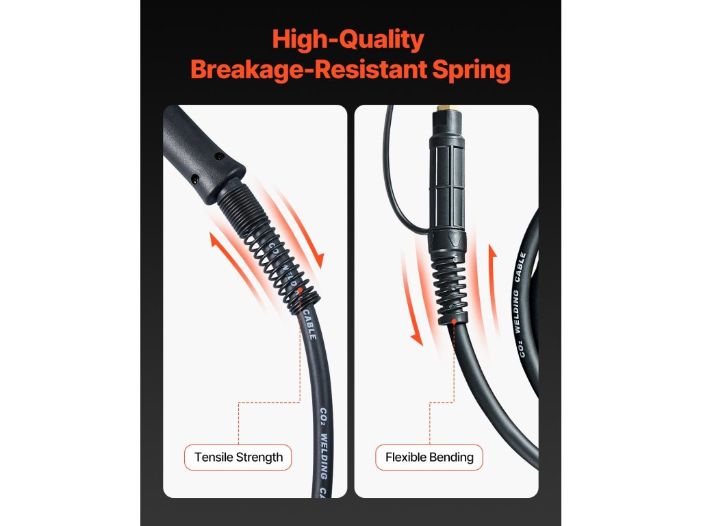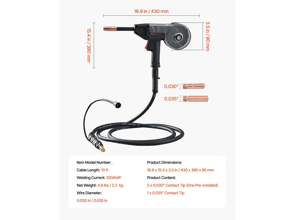 A VEVOR 200A hegesztőpisztoly 10 láb hosszú, kiváló minőségű kábellel van felszerelve, amely kompatibilis a Weldpro MlG200GDsv200 és MIG155GD mig hegesztőgépekkel. Támogatja a 0,030 hüvelykes és 0,035 hüvelykes huzalokat, beleértve az olvadó, tömör és alumínium huzalokat, sokoldalúságot biztosítva a különböző hegesztési feladatokhoz.