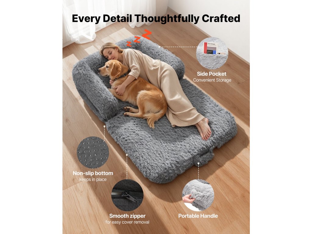 Ez az emberi kutyaágy úgy néz ki, mint egy aranyos kiskutyaágy, de belül ortopéd memóriahabos matracpárnázatot rejt, hogy neked és szőrös barátodnak puha és kényelmes helyet biztosítson, ahol összebújhattok, hogy közel lehessetek egymáshoz, akár szundikáltok, akár csak csendben lógtok.