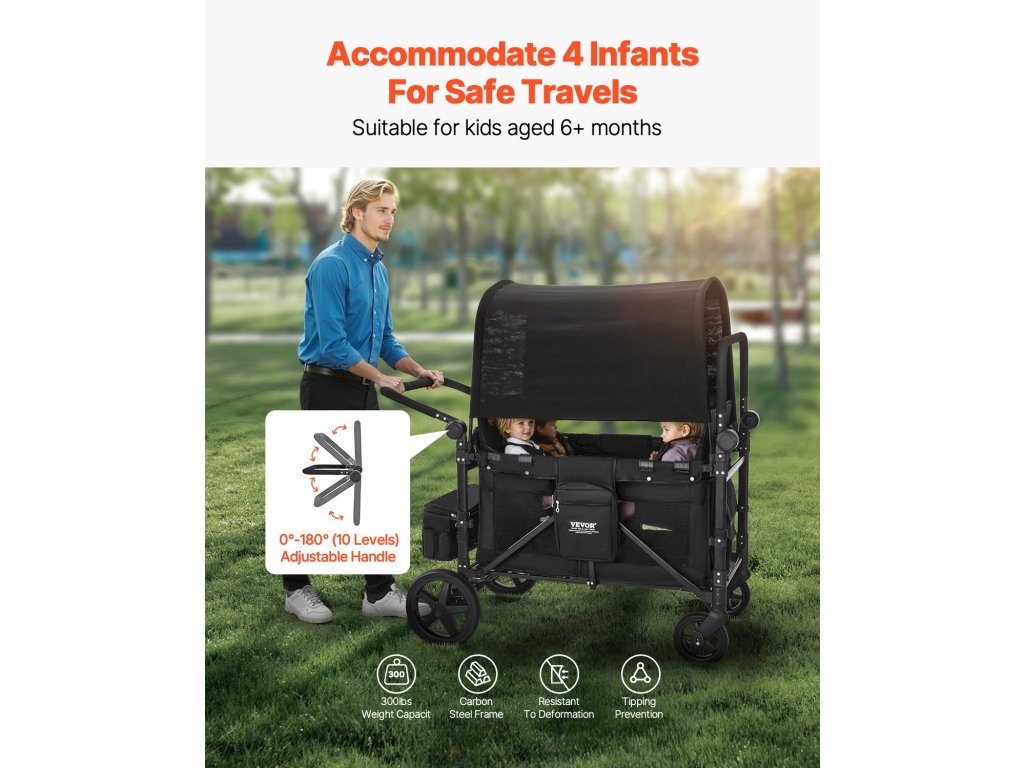 Élvezze a gondtalan életet, és éljen át szórakoztató kalandokat gyermekével! A 4 gyermekes babakocsink összecsukható és hordozható, kényelmesen elfér az autó csomagtartójában vagy otthonában. Szénacél vázzal és kopásálló, ütéscsillapító kerekekkel a legkülönbözőbb terepviszonyokhoz alkalmazkodik.