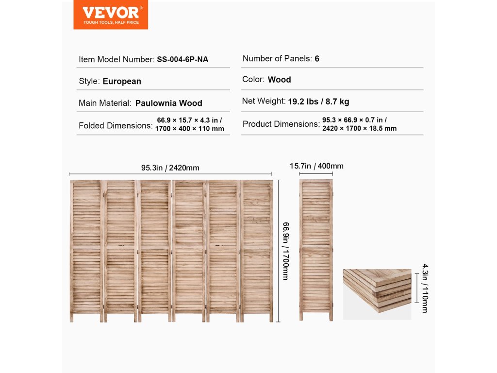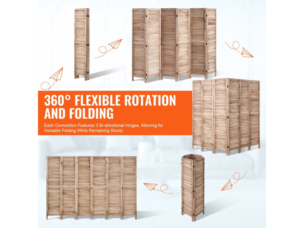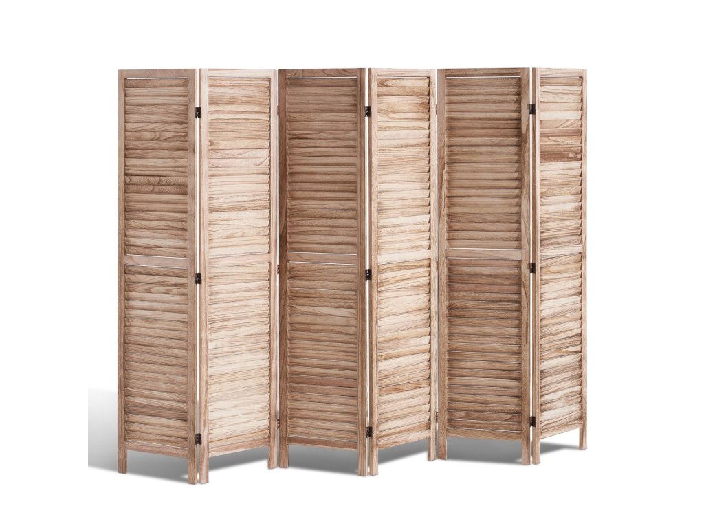 Ez a térelválasztó európai minimalista kialakítású, redőnyökkel és 360°-ban forgatható panelekkel rendelkezik, és könnyen összecsukható. Tartós Paulownia fából készült, és ideális a szobák elválasztására, a magánszféra védelmére és a napfény árnyékolására.