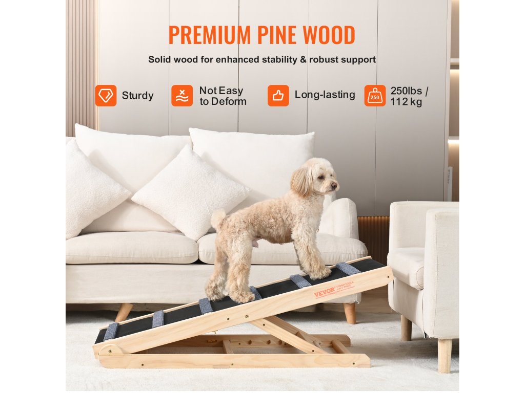 Ez a prémium fenyőfából készült állítható kutyarámpa rendkívül stabil és tartós. Háromszög alakú szerkezete extra szilárdságot biztosít, a csúszásmentes alsó párnák pedig növelik a stabilitást. Kivételes teljesítményének köszönhetően még akkor is stabil marad, ha embereket szállít.