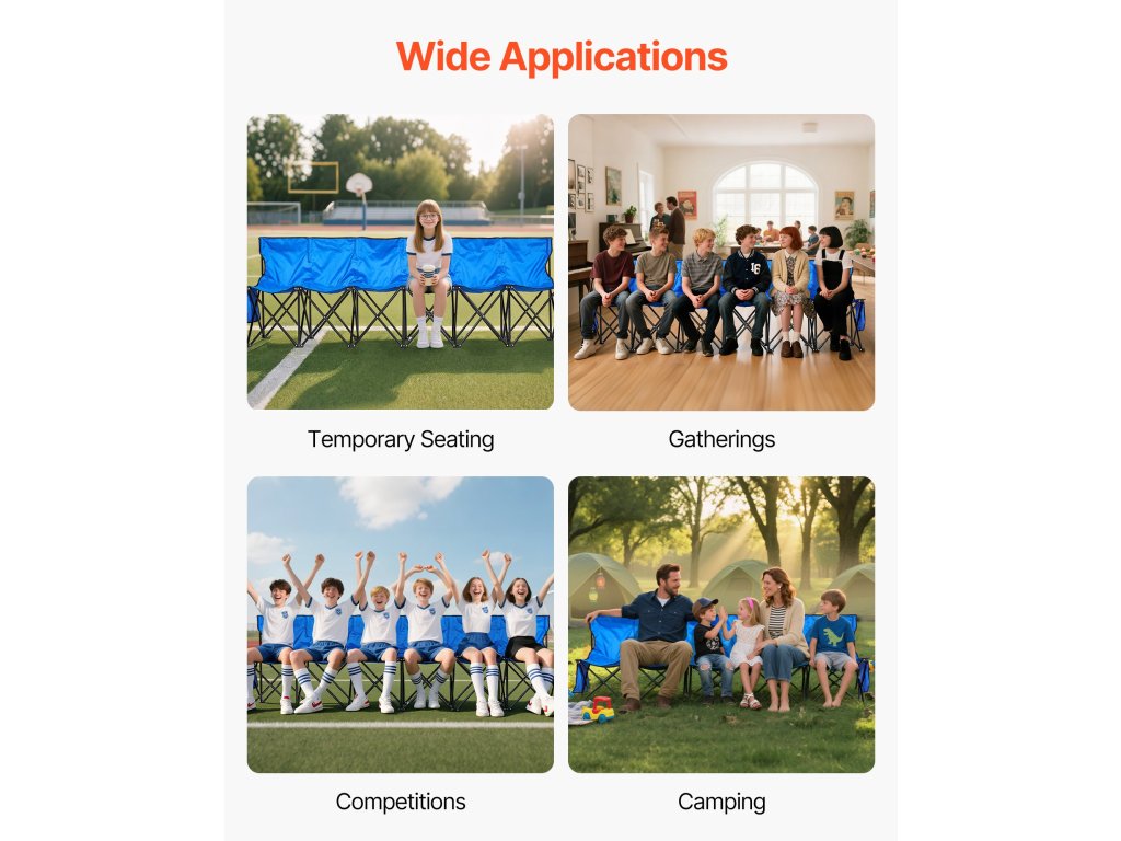 Ez a termék tartós 600D oxford szövetből készült, megerősített, megerősített támasztórudakkal a nagyobb szilárdság és stabilitás érdekében. Az összecsukható kialakításnak köszönhetően ideális sporteseményekre, partikra, szabadtéri kempingezéshez vagy bármilyen alkalomra, ahol szükség van az oldalsó ülőalkalmatosságokra.