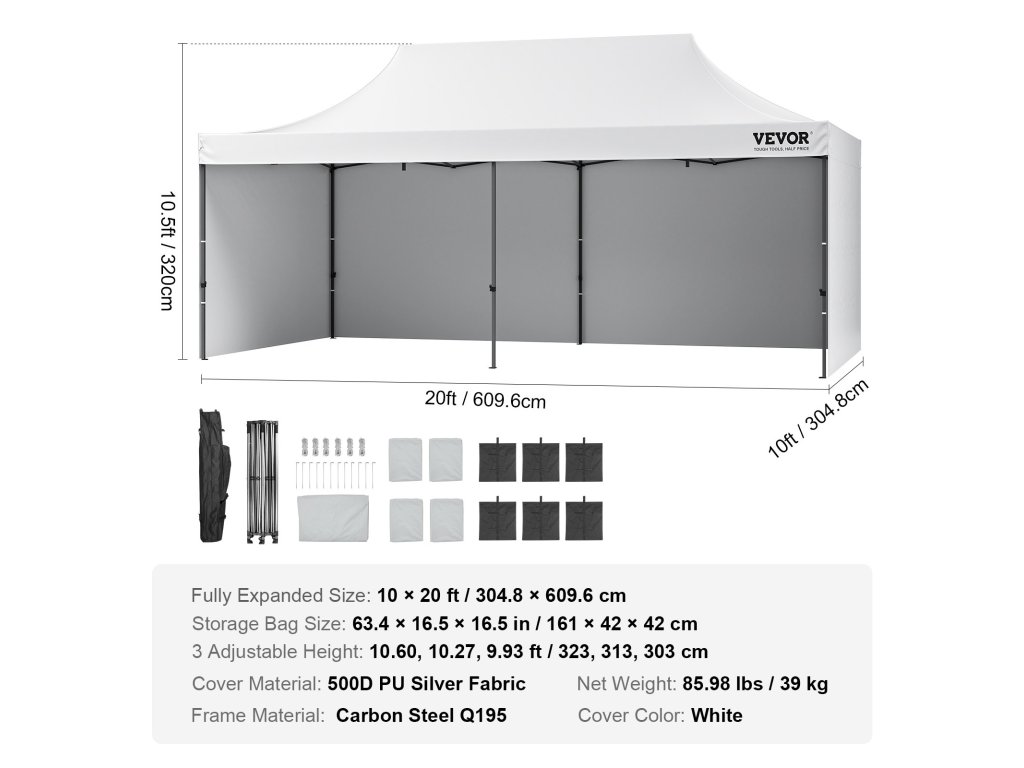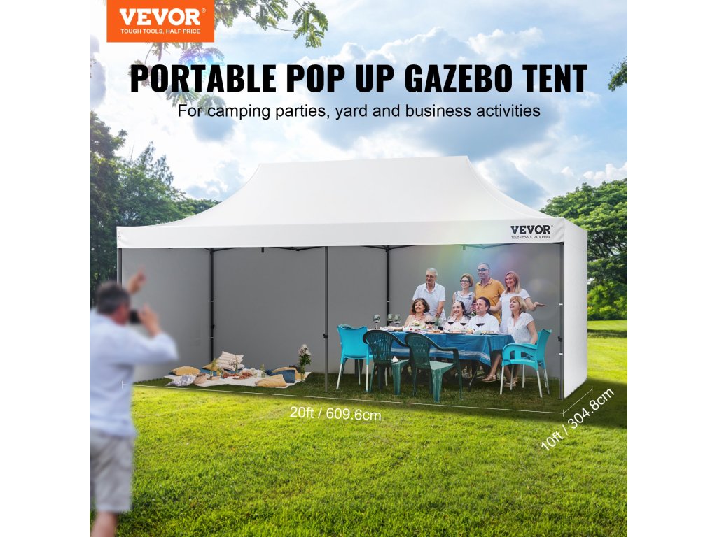 Tento priestranný vyskakovací baldachýn môžete postaviť v priebehu niekoľkých minút. Možno ho použiť na dočasné zhromaždenia, pričom jeho plocha pokrýva 200 štvorcových stôp. Má tri nastaviteľné výšky, ktoré si môžete nastaviť podľa svojich potrieb. Môžete ho nastaviť na výšku 9,84 stopy, 10,2 stopy alebo 10,5 stopy. Táto priestranná konštrukcia vám umožní pohodlne stáť pod baldachýnom. Okrem toho sa doň zmestí až 12-16 osôb. Ľahko sa môžete prechádzať a usporadúvať pohlcujúce stretnutia pod holým nebom.