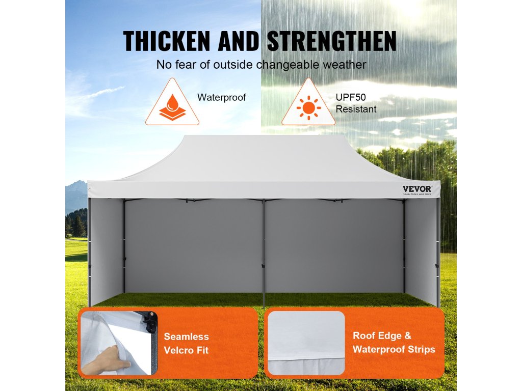 Jeho vrchná časť baldachýnu spolu s nepremokavými pásmi zabraňuje presakovaniu vody, čím zabezpečuje suchú a príjemnú atmosféru vo vnútri baldachýnu, aj keď vonku prší. Okrem toho je jeho rám striešky vyrobený z odolného a pevného materiálu z uhlíkovej ocele Q195. Jeho súčasťou je aj 6 vrecúšok s pieskom na zvýšenie stability dna počas veterných dní. Táto funkcia odolná voči poveternostným vplyvom vám umožní naplno si užiť vaše vonkajšie podujatia bez toho, aby ste sa museli stresovať náhlym dažďom alebo páliacim slnkom.