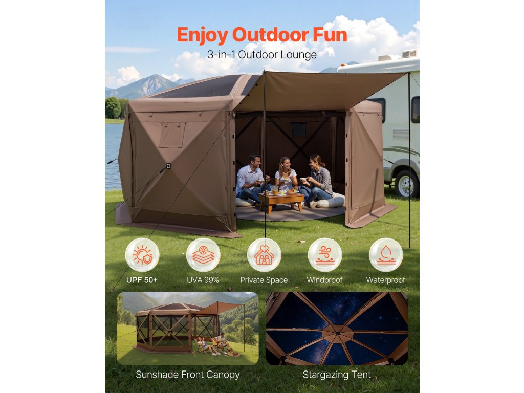 Nagy pavilon képernyővel tágas területet kínál a tevékenységekhez és a családi és baráti összejövetelekhez.A 12x12 lábas méret 8-10 ember befogadására alkalmas.A 2 láb magas 7. lombkorona lehetővé teszi a kényelmes állást és mozgást.
