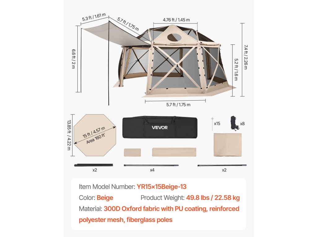Ez a pavilonnal ellátott kemping sátor bőséges helyet kínál az árnyékban végzett tevékenységekhez a család és a barátok szabadtéri összejöveteleihez. A nagyméretű, 15×15 láb méretű, árnyékot adó pavilonsátor 12-15 fő befogadására alkalmas. 4 láb hosszú, 7 tetejű baldachin biztosítja a kényelmes állóhelyet.