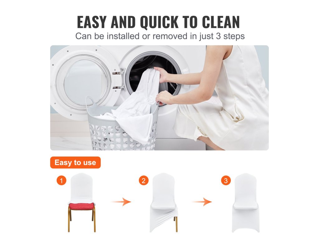 Egyszerűen feszítse őket a székek fölé, és rögzítse a négy lábat az összeszerelés befejezéséhez. Időt és ápolási költségeket takarít meg, nincs szükség vasalásra. A székhuzatok kézzel moshatók, mosógépben moshatók vagy szárazon tisztíthatók enyhe mosószerrel.