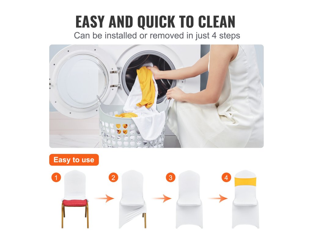 Egyszerűen feszítse őket a székek fölé, és rögzítse a négy lábat az összeszerelés befejezéséhez. Időt és ápolási költségeket takarít meg, nincs szükség vasalásra. A székhuzatok kézzel moshatók, mosógépben moshatók vagy szárazon tisztíthatók enyhe mosószerrel.
