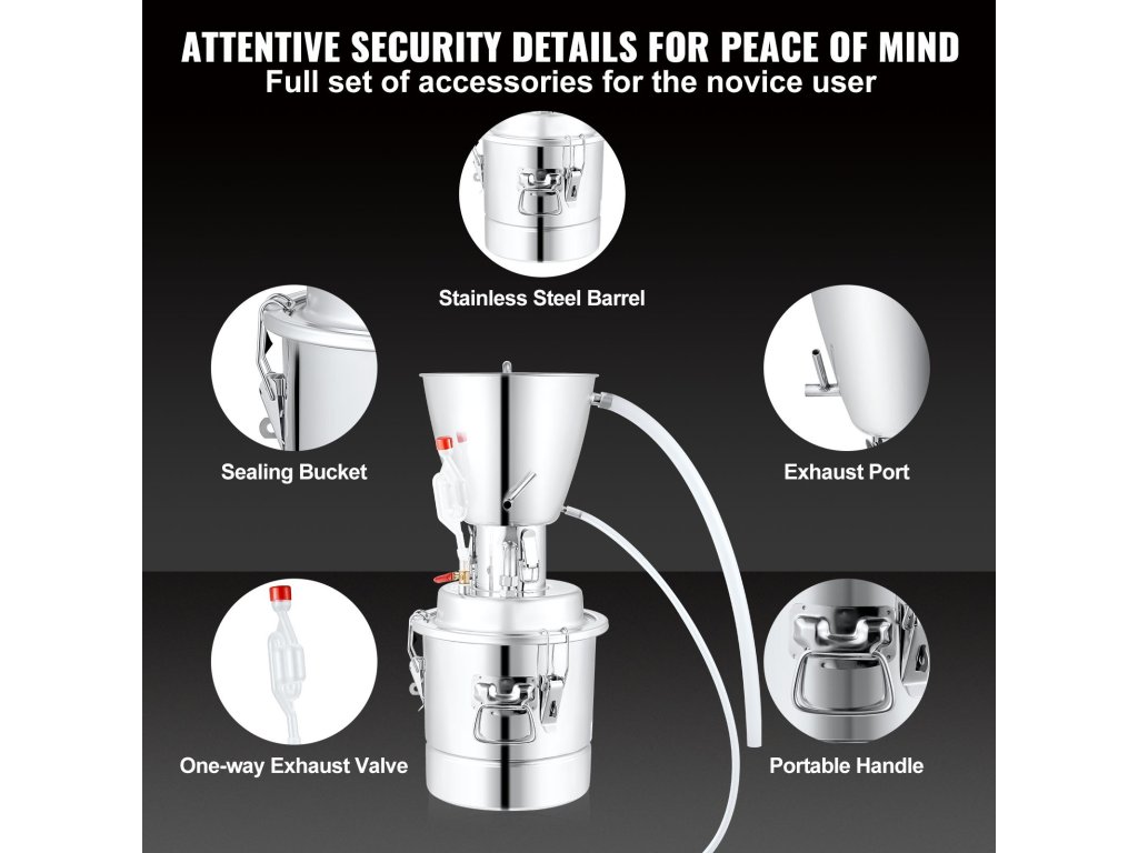 Ez a szeszfőző felszereléskészlet ideális kezdőknek és profiknak egyaránt. Egy egyszerűbb és hatékonyabb desztillációs módszerrel, a 304 tekercses kondenzátor kialakításával még a kezdők is képesek whisky, pálinka és különféle gyümölcsborok, víz és illóolajok lepárlására.