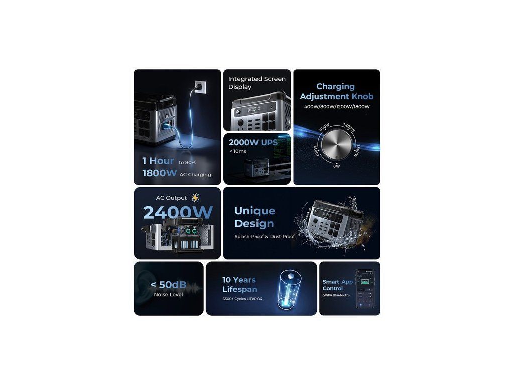 A 2048Wh és 2400W névleges teljesítményű készülék 13 univerzális konnektoron keresztül képes a készülékek 99%-ának áramellátására (4 AC konnektor, 2 USB-A port a 3.0 gyors töltéshez, 4 USB-C PD port [20W, 45W, 100W], 2 DC konnektor és 1 szivargyújtó). Ideális szabadtéri, hálózaton kívüli tevékenységekhez és otthoni tartalék áramforrásként a legtöbb készülékhez, telefonhoz, laptophoz, elektromos szerszámokhoz, konyhai eszközökhöz, járműre szerelt termékekhez és távirányítású repülőgépekhez.