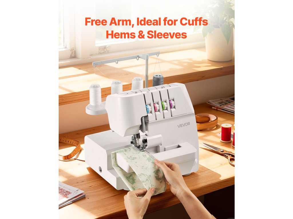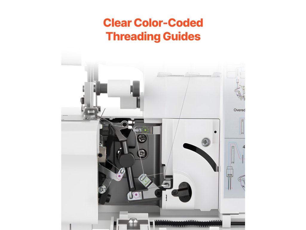 A varrógépen található színkódolt fonalvezető hornyok megkönnyítik és érthetővé teszik a beállításokat. A szabad kar ujjakhoz, mandzsettákhoz és más szűk területekhez illeszkedik. A LED-világítással és az állítható nyomólábbal az öltések tiszták és egyenletesek maradnak a különböző szövetvastagságokon.