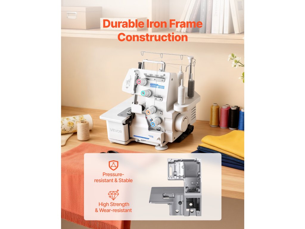 Ez a vasból és műanyagból készült overlock varrógép kiváló szilárdságot és ütésállóságot biztosít a stabil, alacsony rezgésszámú működéshez. Tartós konstrukciója elősegíti a hosszú távú használatot, megbízható teljesítményt nyújt, miközben idővel csökkenti a csereköltségeket.