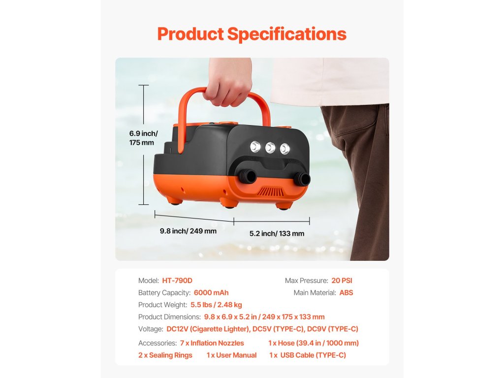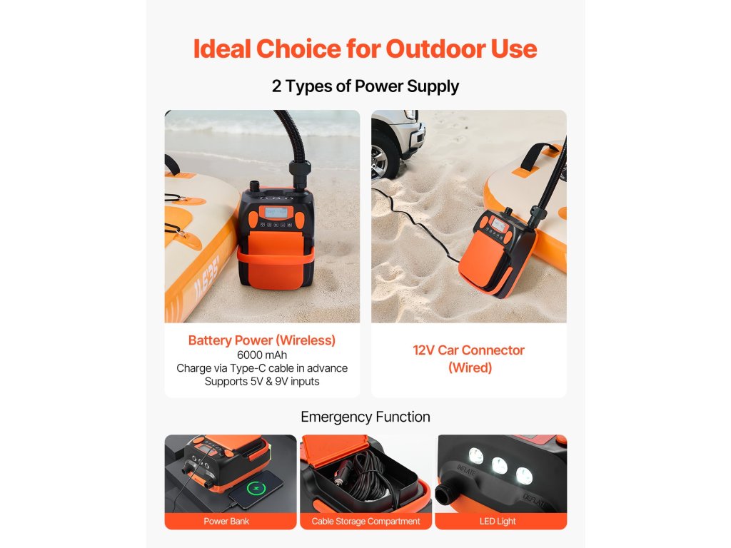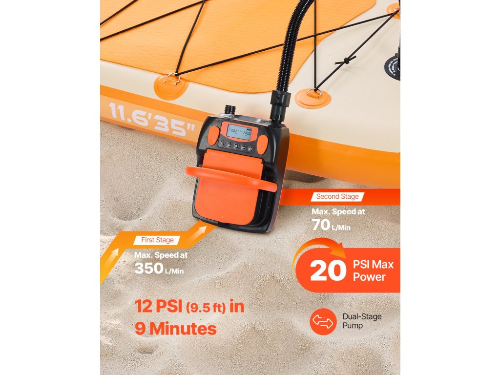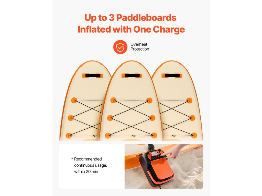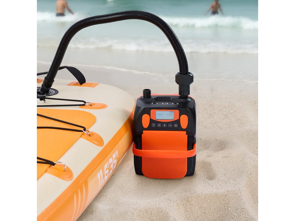 A szabadtéri sportok szerelmeseinek tervezett elektromos paddleboard pumpa 9 perc alatt felfújja a paddleboardot 12 PSI értékre (9,5 láb). Digitális kijelzővel, memóriafunkcióval, 6000 mAh-s akkumulátorral és integrált kábeltárolóval rendelkezik, így utazáshoz és kempingezéshez is alkalmas.