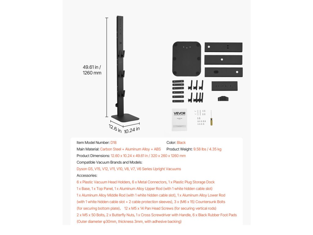Ez a porszívóállvány 49,6 hüvelyk magasságot és 6 kampót biztosít a különböző modellekhez. Tartós talapzattal, szénacél vázzal és csúszásmentes lábakkal rendelkezik, stabil és kompakt, ideális kis helyiségekbe. Könnyen felszerelhető a falba fúrás nélkül, és ideális tárolási megoldás.