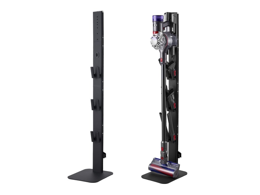 A porszívó állványtartó 6 kampóval van felszerelve a porszívókefék, tömlők és egyéb tartozékok rendezett tárolására, megakadályozva azok elvesztését vagy sérülését. Emellett a hátoldalon található kábelelvezető nyílás segít a kábelek rendezett tárolásában, míg a kijelölt töltőaljzat lehetővé teszi, hogy a porszívót rögtön a tárolás után feltölthesse.