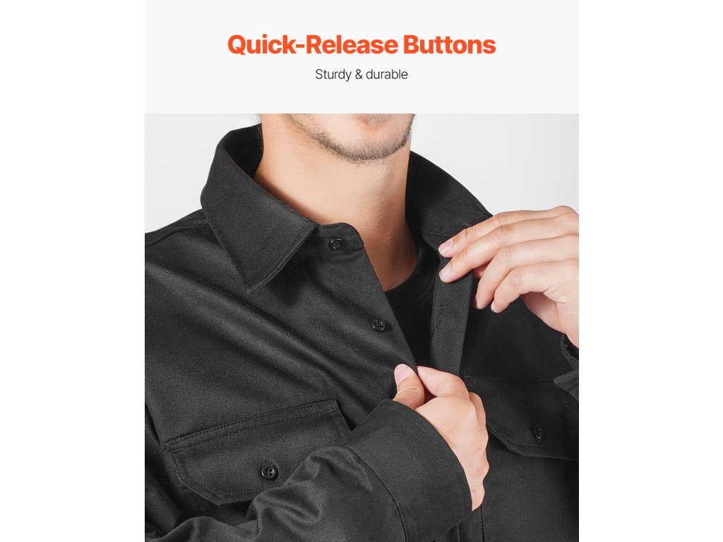 Az átgondoltan kialakított gallér fokozott nyakvédelmet nyújt a biztonság érdekében. Az állítható mandzsetták jobb illeszkedést kínálnak, nagyobb rugalmasságot biztosítva munka közben. A gyorskioldású műanyag gombok megkönnyítik a hegesztő biztonsági kabát fel- és levételét.