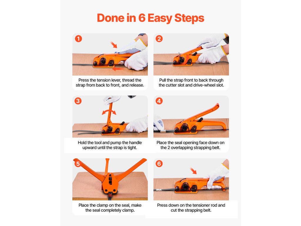 A pántoló készlet továbbfejlesztett, edzett acélból készült, és extra hosszú fogantyúval rendelkezik, amelyet úgy terveztek, hogy a kar működtetése munkaerőt takarítson meg, és növelje a pántolás szilárdságát. A pántoló készlet erős fogással rendelkezik, felgyorsítja a csomagolást és biztosítja a hatékonyságot, valamint rugalmas és ellenőrizhető működést tesz lehetővé.