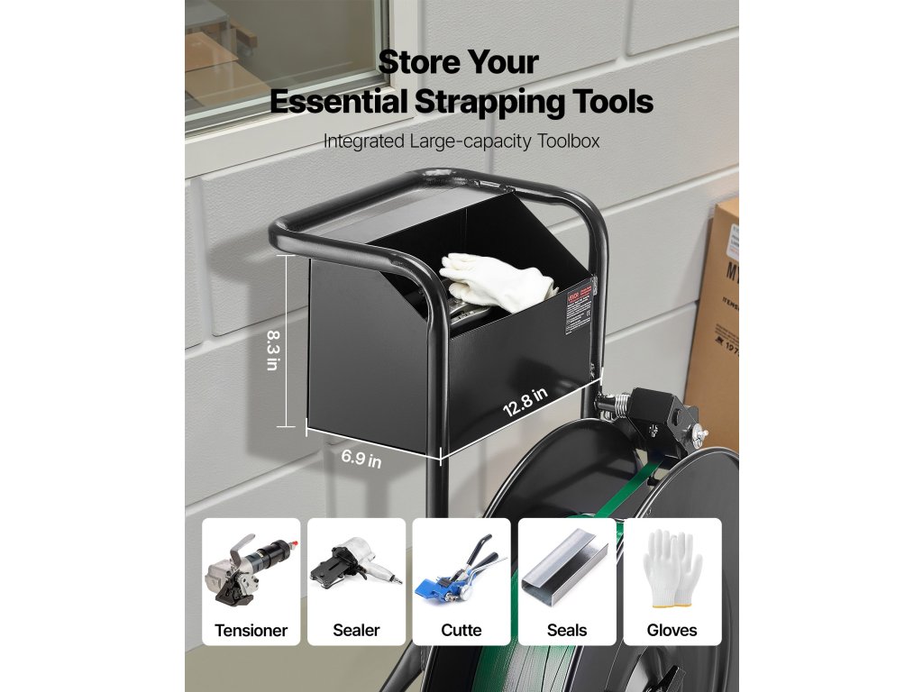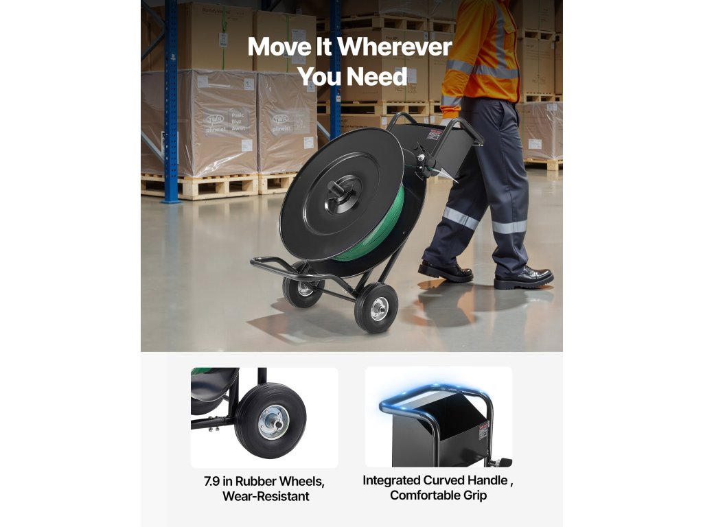 7,9 hüvelyk átmérőjű gumikerekekkel rendelkezik, amelyekkel könnyen mozgatható bármely helyre, csökkentve az erőkifejtést és növelve a szalagozás hatékonyságát.
