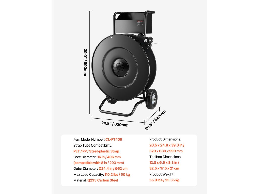 Ez a pántszállító kocsi a 16 hüvelykes / 8 hüvelykes maggal rendelkező PET/PP/acél pánttekercsekhez alkalmas, és dobfékrendszerrel rendelkezik a pántszalag könnyű és hatékony használata érdekében.