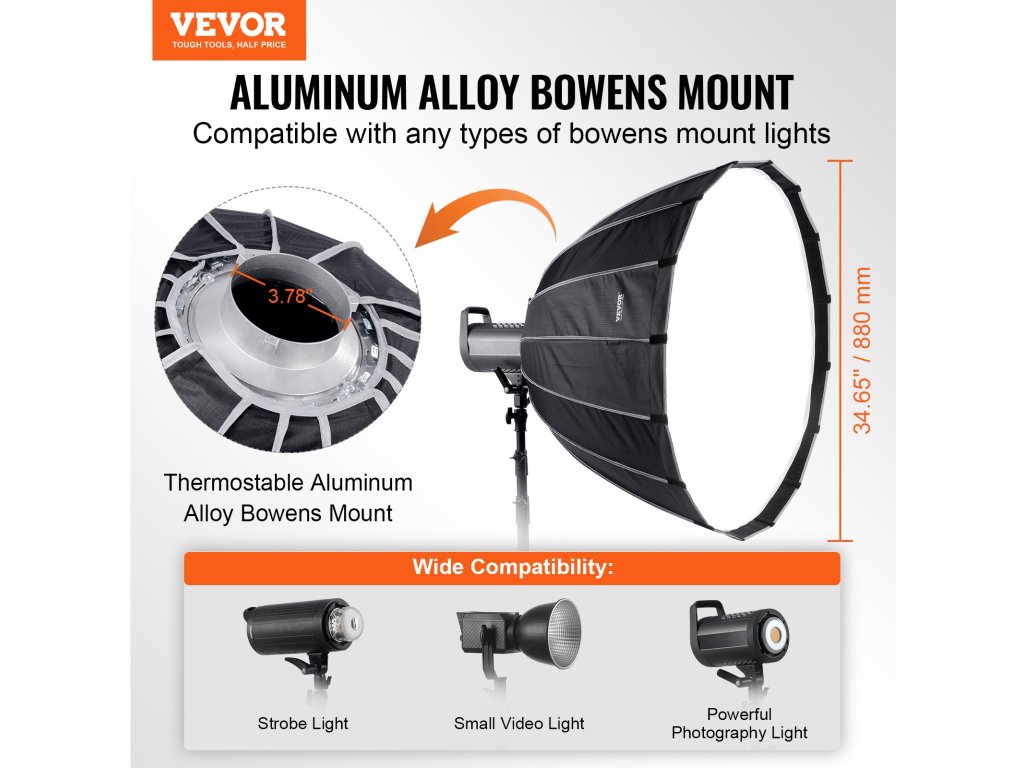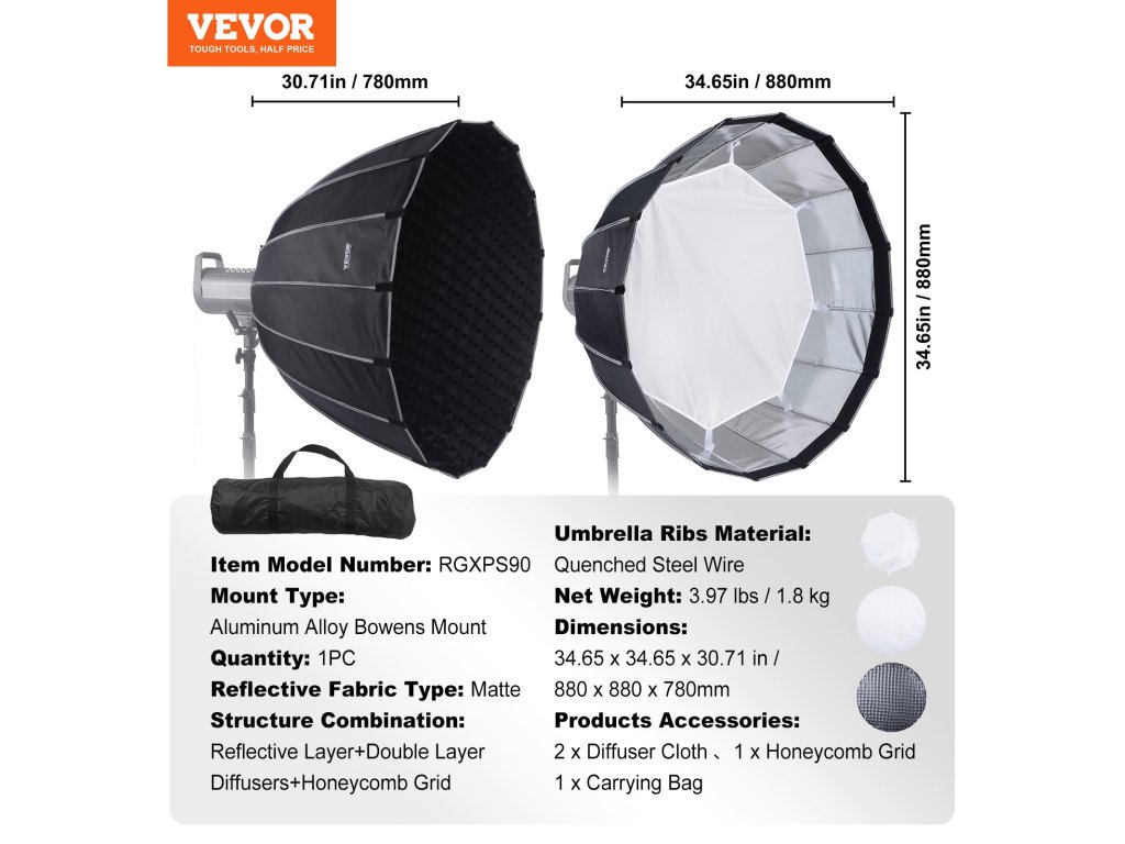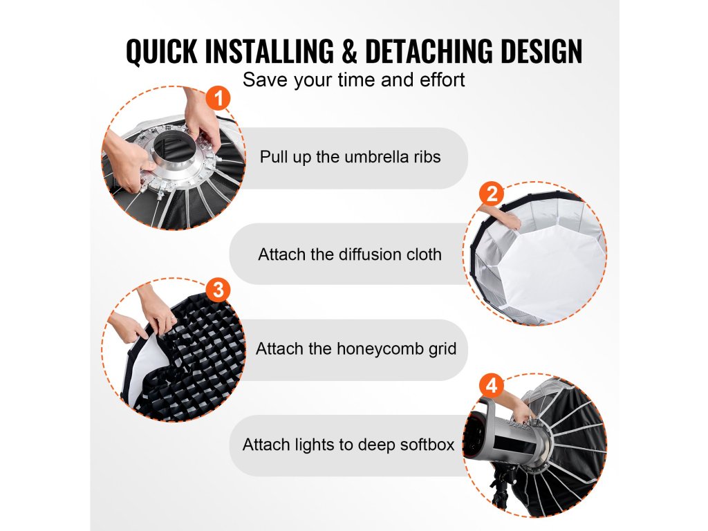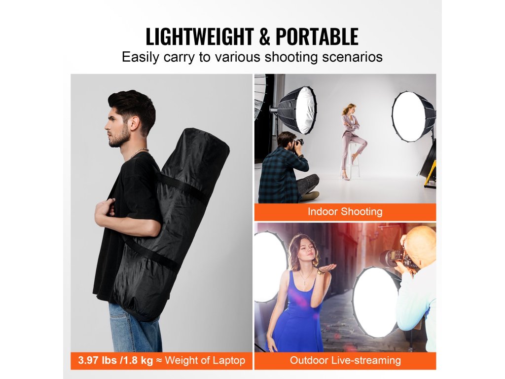 Ez a softbox edzett acélhuzalból készült esernyőbordákból készült, amelyek erősebb tartást biztosítanak a parabola alaknak. Ez biztosítja, hogy a bordák nem deformálódhatnak könnyen, erős rugalmassággal, könnyű és tartósabb.