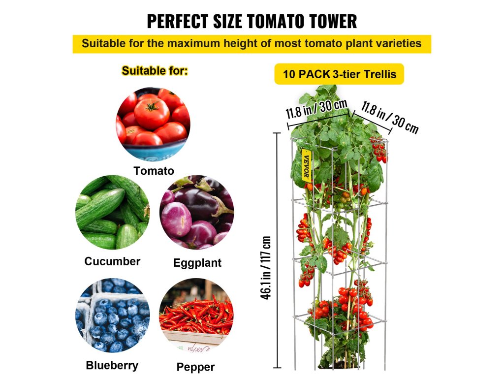 A függőlegesen növekvő növényekkel ellentétben a paradicsomketrecek támogatása nélkül, a mi paradicsomketreceink segítségével könnyebb betakarítani a növényeket. Ideális gyümölcs-, zöldség- és egyéb kúszónövényekhez.
