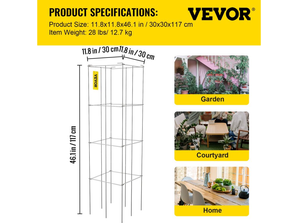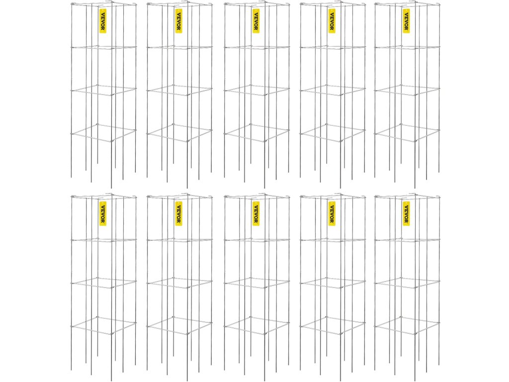 10 db 3 szintes ketrec készletet tartalmaz, mindegyik készlet mérete 11,8 "L x 11,8 "W x 16,1 "H/ 30 x 30 x 117 cm, beleértve a 10"/26 cm-es lábakat. Max. 59.1"/ 150 cm magas növény stabilan állhat a talajban is.