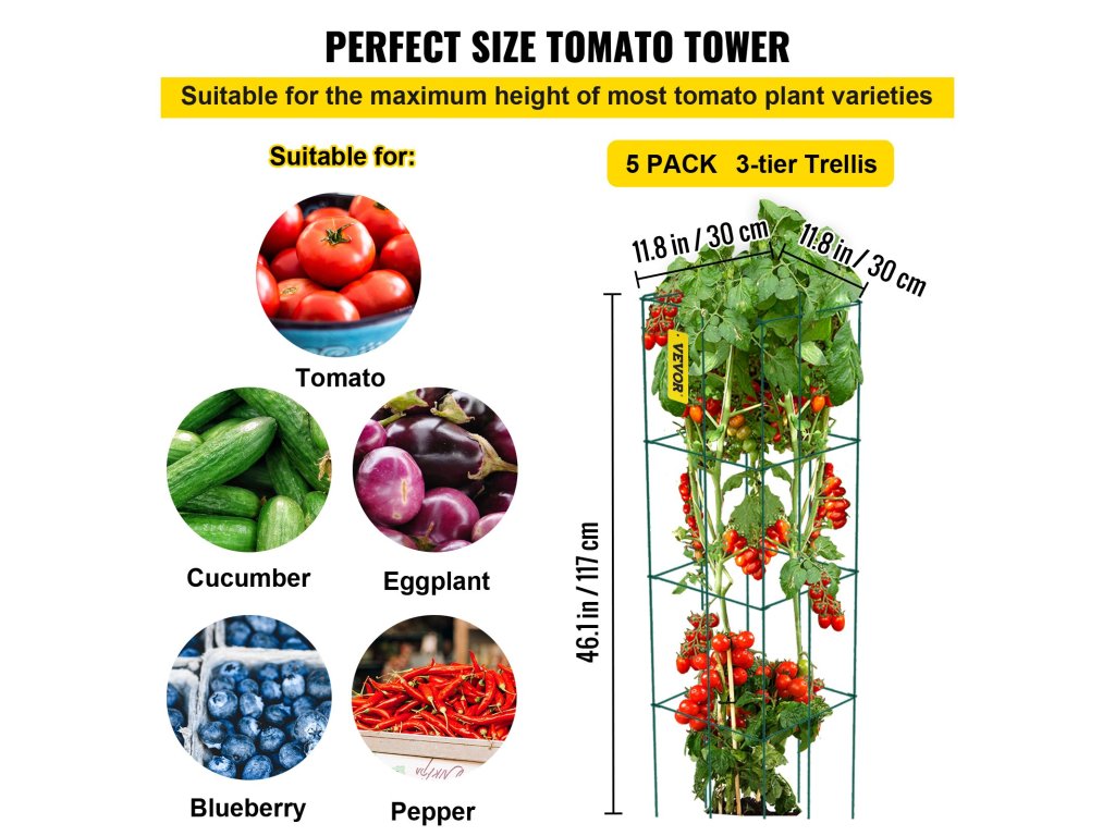 A függőlegesen növekvő növényekkel ellentétben a paradicsomketrecek támogatása nélkül, a mi paradicsomketreceink segítségével könnyebb betakarítani a növényeket. Ideális gyümölcs-, zöldség- és egyéb kúszónövényekhez.