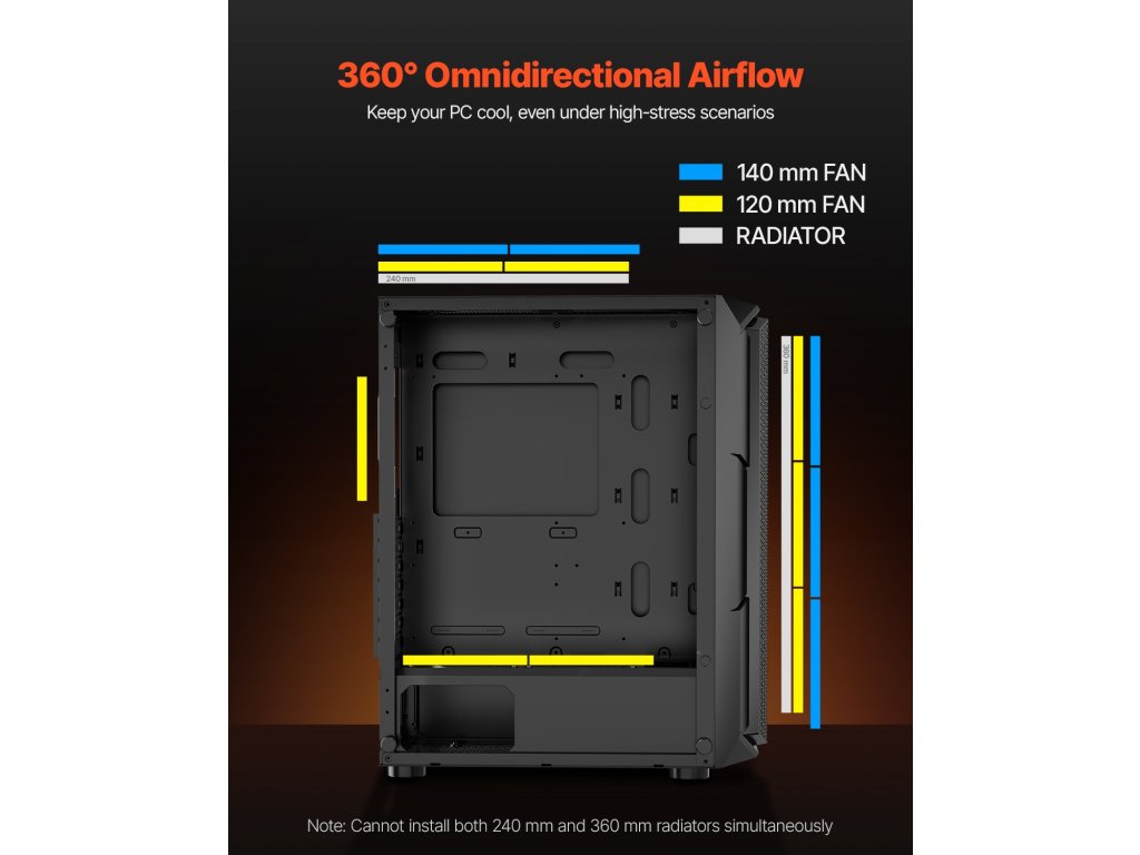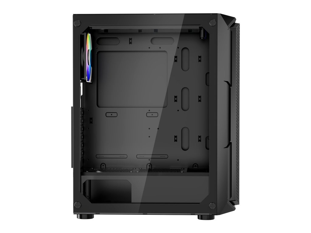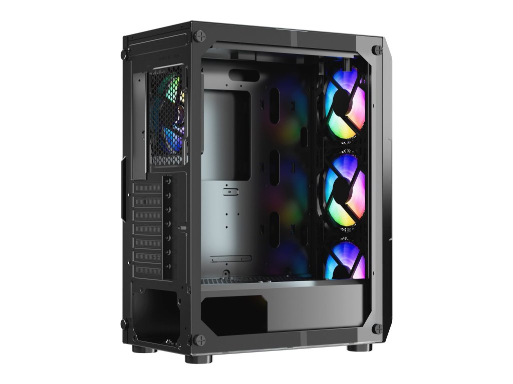 Ez a szekrény 4 x 120 mm-es ARGB ventilátorral van felszerelve, amelyek kiváló hűtési teljesítményt nyújtanak, miközben élénk fényeffektusokkal magával ragadó játékhangulatot teremtenek. SPCC acélból és edzett üvegből készült, ATX alaplapokkal kompatibilis, és legfeljebb 4 merevlemezt támogat.