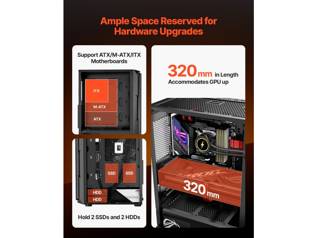 V: Igen, így van! Ez a tok kompatibilis az ATX alaplapokkal, és legfeljebb 12,6 hüvelyk/320 mm hosszúságú GPU-kat támogat. Rengeteg belső helyet biztosít, akár 360 mm hosszú hűtőkkel is kompatibilis.