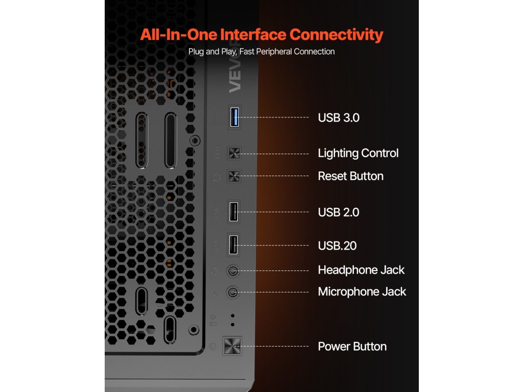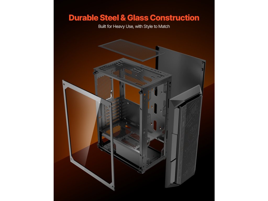 V: A tok SPCC acélból készült, megerősített sarkokkal a további védelem érdekében. Az egyik oldalsó panel edzett üvegből készült, amely a hagyományos tokoknál körülbelül kétszer nagyobb ütésállóságot biztosít.