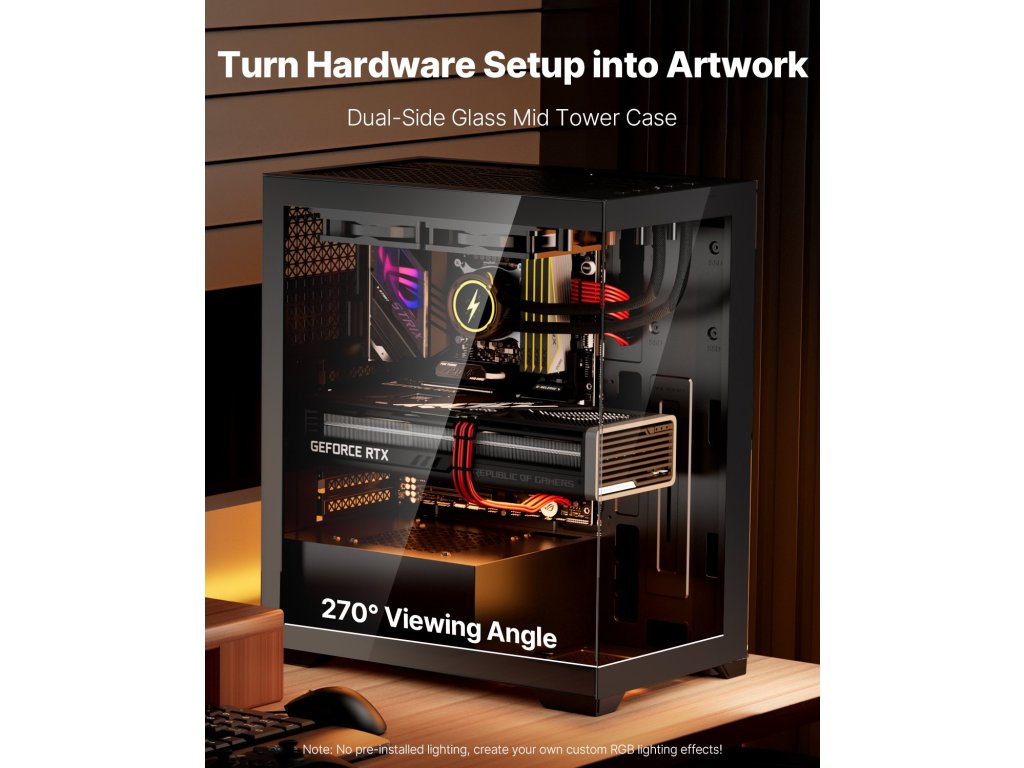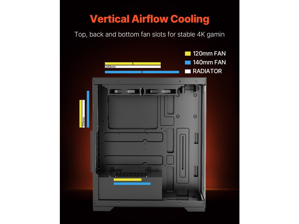 A kiváló minőségű SPCC acélból és dupla edzett üvegpanelekből készült PC tok kompatibilis az ATX alaplapokkal. 2 x 120 mm-es ventilátorral rendelkezik, és akár 4 x 120 mm-es vagy 140 mm-es ventilátort is támogat, így biztosítva a nagy teljesítményű hűtést. Akár 3 merevlemezt is támogat (2 x 2,5 hüvelykes SSD és 1 x 3,5 hüvelykes HDD).