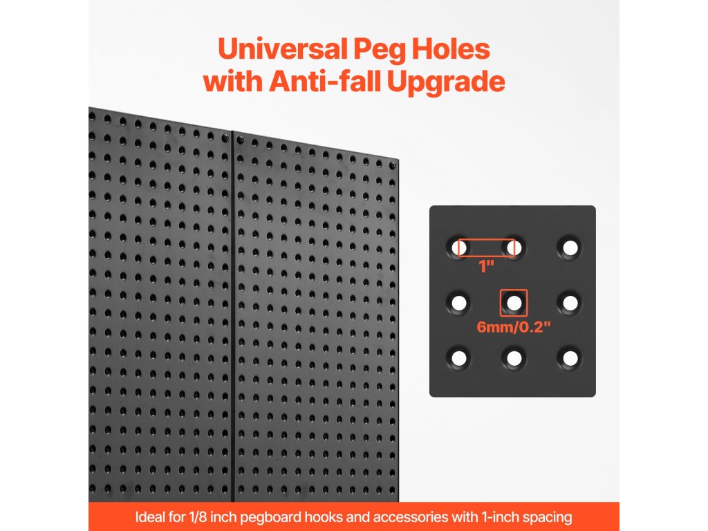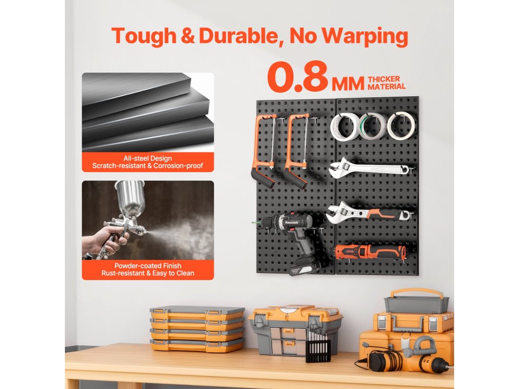A fém tűlemezben rengeteg hely van, így különféle kampókkal, tartókkal és alkatrésztálcákkal párosítható. Legyen szó nagyméretű szerszámokról vagy apró alkatrészekről, könnyen megtalálja mindennek a tökéletes helyet.