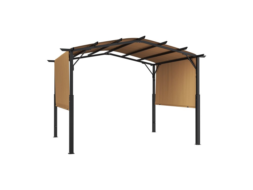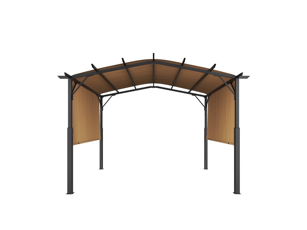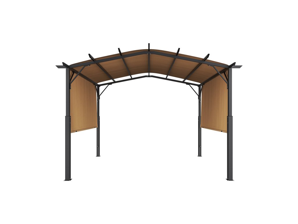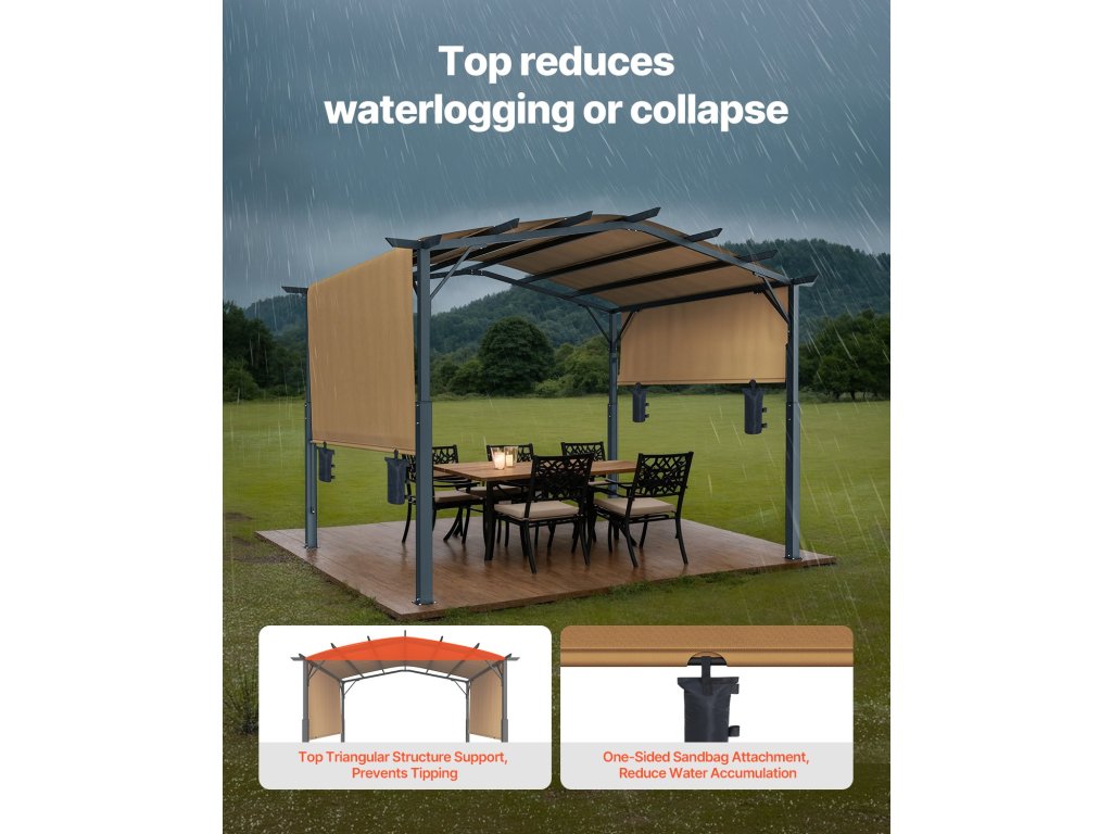 A 10×12 láb méretű íves pergolánk szénacél vázzal és poliészter PA vízálló anyaggal rendelkezik a tartósság érdekében. A pavilon oldalai rögzítőkapcsokkal és homokzsákokkal vannak ellátva a víz felgyülemlésének megakadályozására és a felső rácsok védelmére. Ez a pergola ideális árnyékos menedékhely kialakítására a hátsó udvarban, kertben.