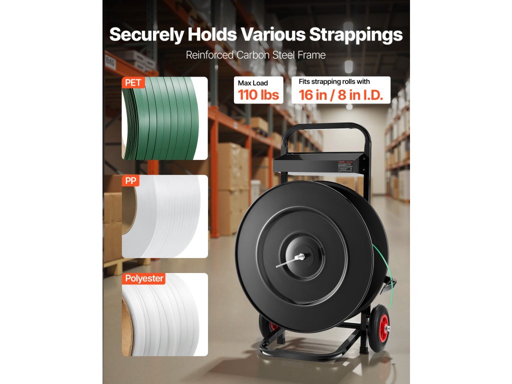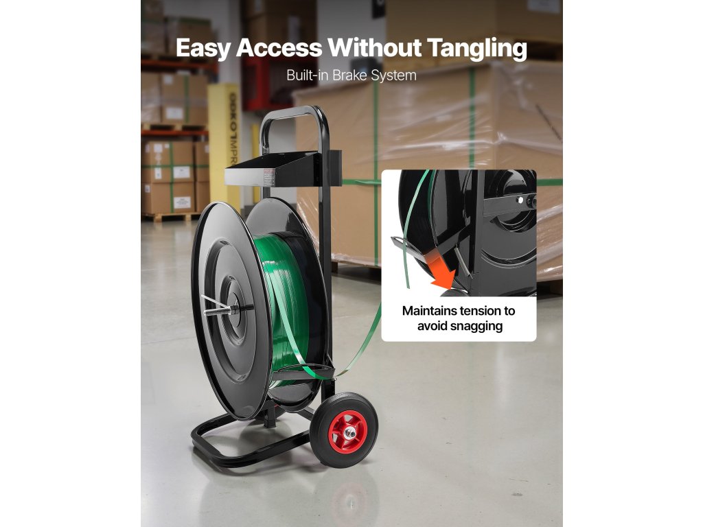 Ez a pántszalagkocsi 16"/8" maggal rendelkező PET/PP/poliészter pántszalagtekercsekhez alkalmas, és automatikus fékrendszerrel van felszerelve a pántszalag könnyű és hatékony használata érdekében.