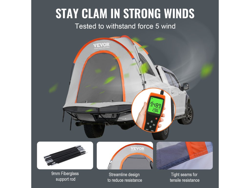 Náš stan VEVOR Truck Bed je špeciálne vyrobený pre pickupy. V priebehu niekoľkých minút premení vaše vozidlo na pohodlný prístrešok. Vďaka vnútornému priestoru s rozmermi 79 x 65 x 67 palcov je v ňom dostatok miesta pre dve až tri osoby. To zaručuje útulný a bezpečný spánok. Stan sa veľmi ľahko stavia. Môžete ho postaviť už za 5 minút, takže je ideálny na rýchle výlety alebo nečakané dobrodružstvá.