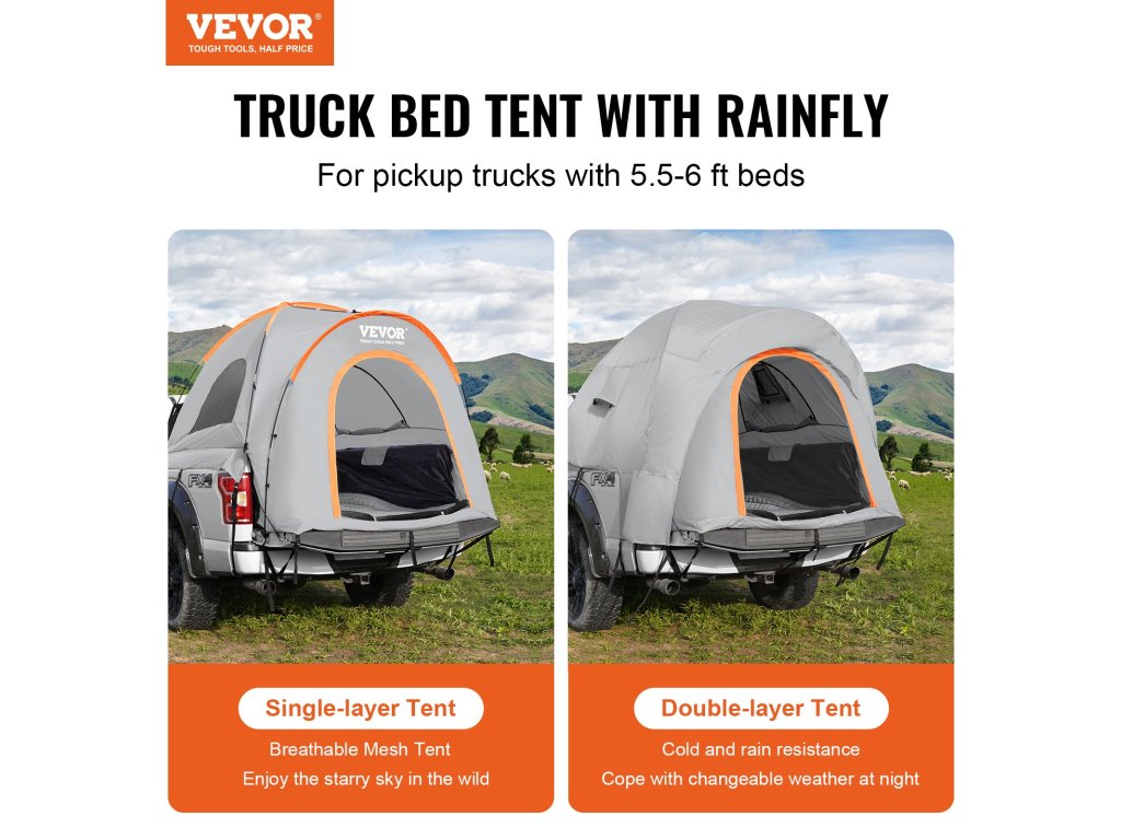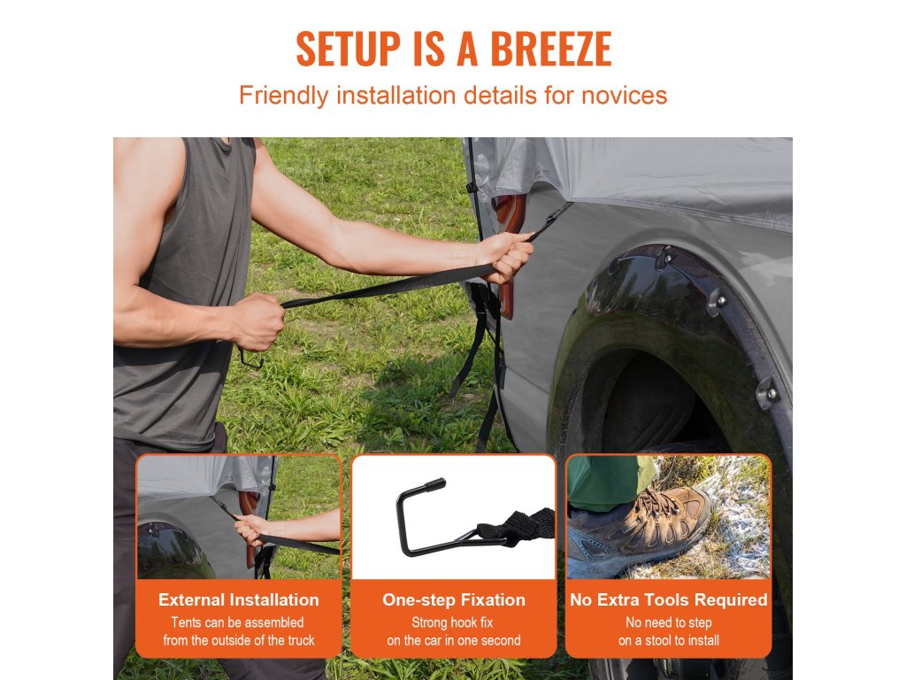 Stan VEVOR do lôžka nákladného auta je vyrobený na jednoduchú montáž a demontáž. Môžete ho postaviť v priebehu niekoľkých minút, čím sa skráti čas prípravy. Vďaka jednoduchým pokynom a intuitívnemu dizajnu je užívateľsky prívetivý. Keď ho zbalíte, rovnako rýchlo ho aj zložíte. Toto pohodlie vám zaručí, že sa budete viac sústrediť na vychutnávanie si cesty. Je ideálny pre tých, ktorí uprednostňujú minimum starostí. Užite si bezproblémové kempovanie s týmto ľahko ovládateľným kempingovým stanom pre nákladné vozidlá.