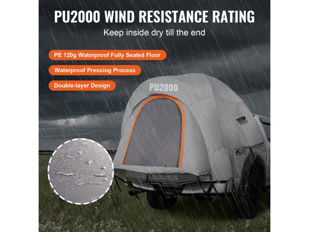 Stan VEVOR na lôžko nákladného auta má vodotesnú dvojitú vrstvu PU2000 mm. Táto ochrana chráni pred dažďom a prudkým vetrom. Nebudete sa musieť obávať netesností ani vlhkosti. Dvojvrstvová konštrukcia zaručuje, že voda neprenikne. Je ideálny na kempovanie v nepredvídateľnom počasí. Môžete kempovať bez obáv s vedomím, že ste chránení pred nepriazňou počasia. Spojte dokonalú ochranu pred nepriaznivým počasím s pohodlím pri využívaní ideálneho stanu pre pickupy. Užívajte si každé kempovanie v daždi či v slnku bez stresu.