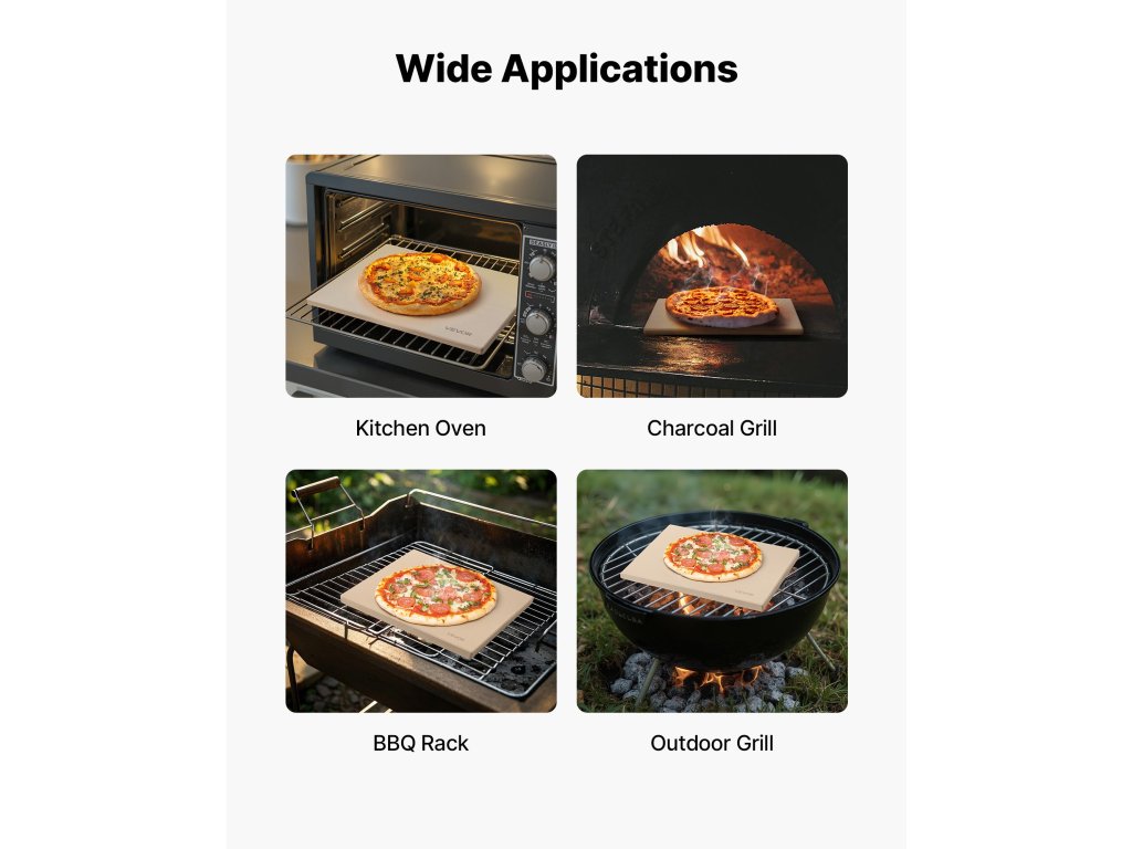 Cordierit pizzakövünk minden méretű konyhai eszközhöz alkalmas, beleértve a sütőket, grillezőket és grillezőket is. Kérjük, vásárlás előtt ellenőrizze a méreteket, hogy megbizonyosodjon a megfelelő illeszkedésről.