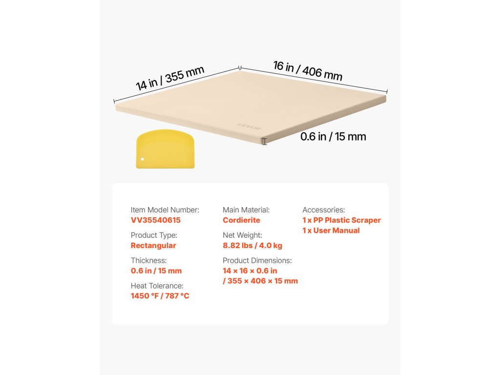 A téglalap alakú pizzakő megvastagított kordieritből készült, amely akár 1450 °F/787 °C-ig ellenáll a magas hőmérsékletnek. Hosszú időn keresztül képes a hőt felhalmozni, és egyenletesen vezeti a hőt, így megakadályozza az átázott pizzát és a részleges megégést, valamint növeli a sütés sikerét.