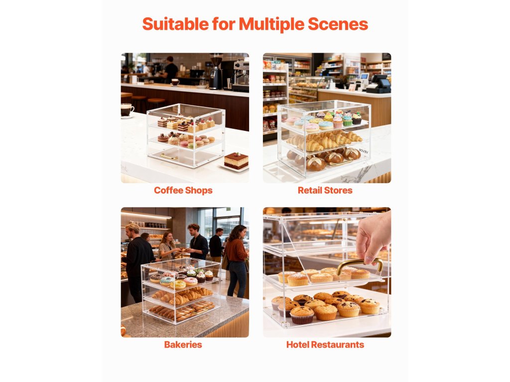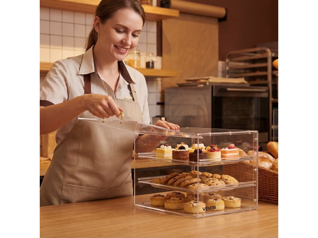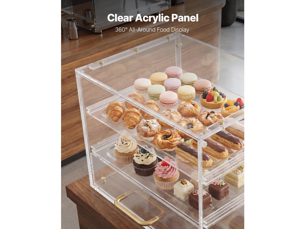 Ezt az akril péksüteményes vitrint úgy tervezték, hogy a péksüteményeket szépen bemutassa a polcokon, és tiszta, teljes látványt nyújtson, amely vonzza a vásárlókat. A könnyű, mégis stabil, átlátszó akrilszerkezet kiemeli a pékárut, miközben stabilitást, tartósságot és könnyű hordozhatóságot biztosít.