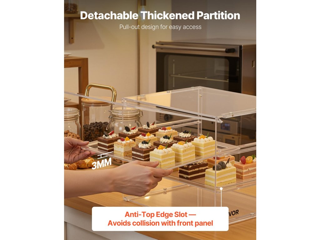 Ez a desszertvitrin megerősített polcokat használ az extra szilárdság és tartósság érdekében. Kiváló minőségű, nagy átlátszóságú akrilból készült, és kristálytiszta 360°-os kilátást biztosít a süteményekre. A továbbfejlesztett ajtórendszer kényelmes feltöltést és könnyű tisztítást biztosít, miközben a megjelenés hibátlan marad.