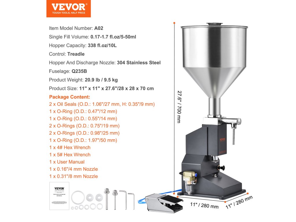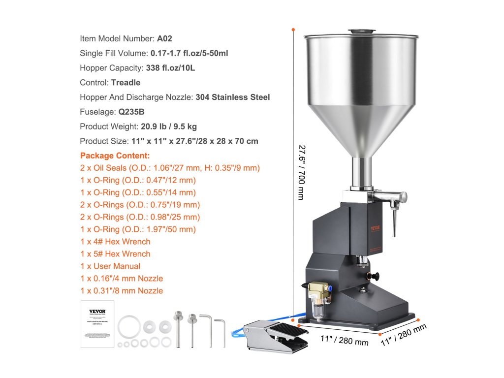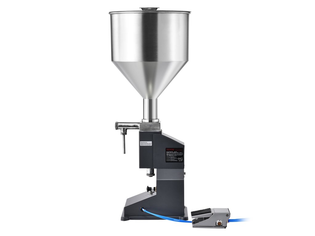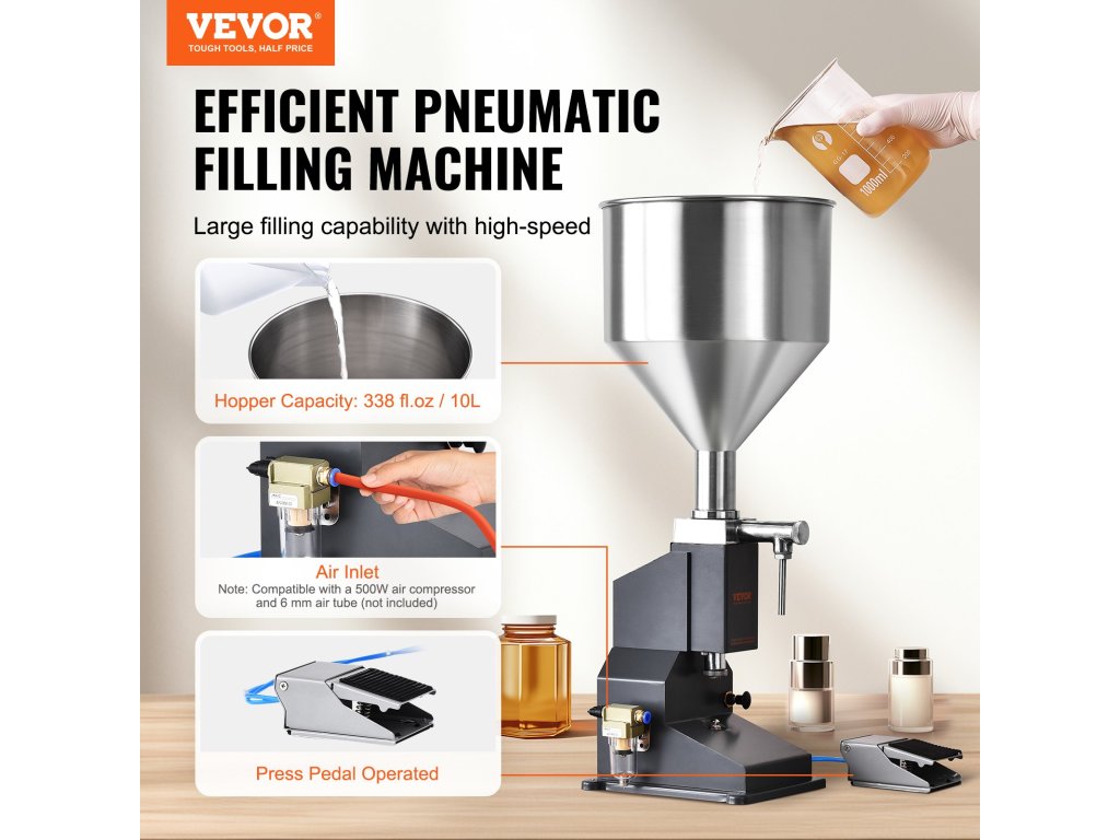 Ez a pneumatikus töltőgép ideális méz, víz és más folyadékok töltésére. Élelmiszer minőségű anyagokból készült, és ideális otthoni és műhelyi használatra. Megjegyzés: Saját 500 W-os légkompresszort és 6 mm-es légtömlőt kell biztosítania a csatlakozáshoz.