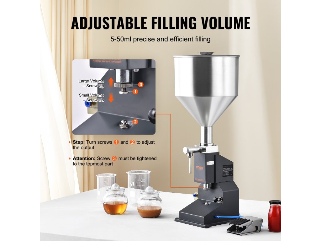 A töltési mennyiséget könnyen finomhangolhatja kis edényekkel. Csak forgassa el a folyadéktöltő csavarjait, és állítsa be 5 ml-től 50 ml-ig. Ezt követően a pedál minden egyes lenyomása biztosítja a pontos töltést. Ez az egész a testreszabható kényelemről szól!