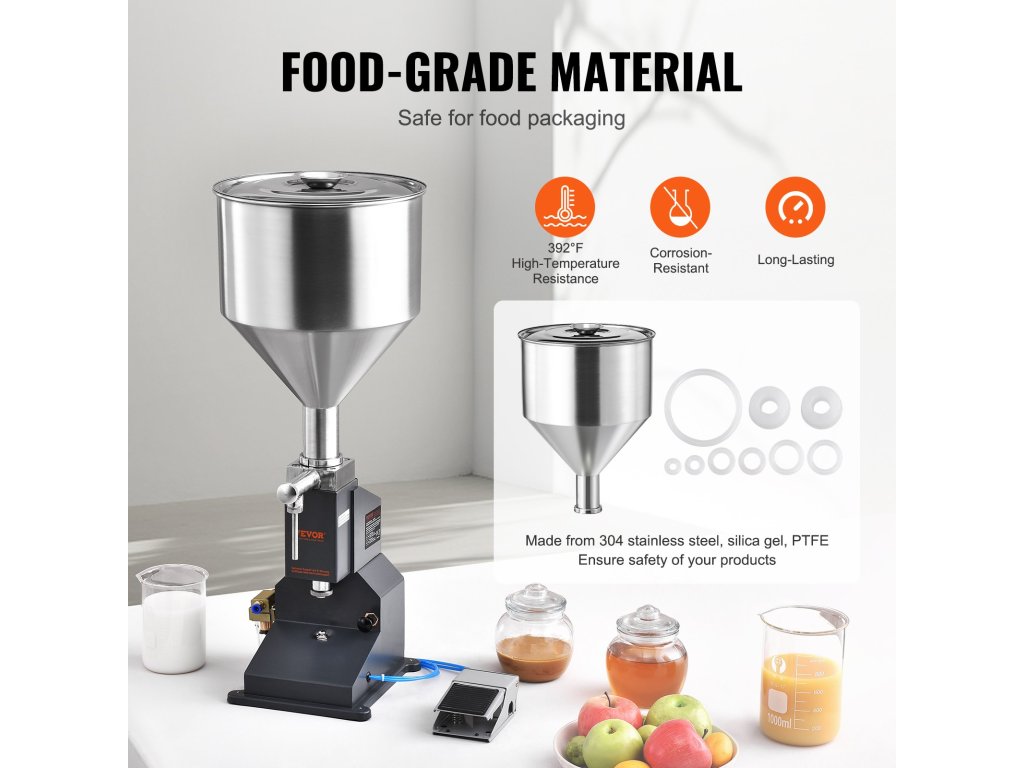 Itt nincs műanyag! Ez a palacktöltő gép élelmiszeripari minőségű 304 rozsdamentes acélból, szilikonból és PTFE-ből készült a korrózióállóság érdekében. Akár 392℉/200 ℃ hőmérsékletet is kibír. A mellékelt tömítőgyűrűknek köszönhetően nincs szivárgás. A nagy tartály kevesebb újratöltést és nagyobb hatékonyságot jelent.